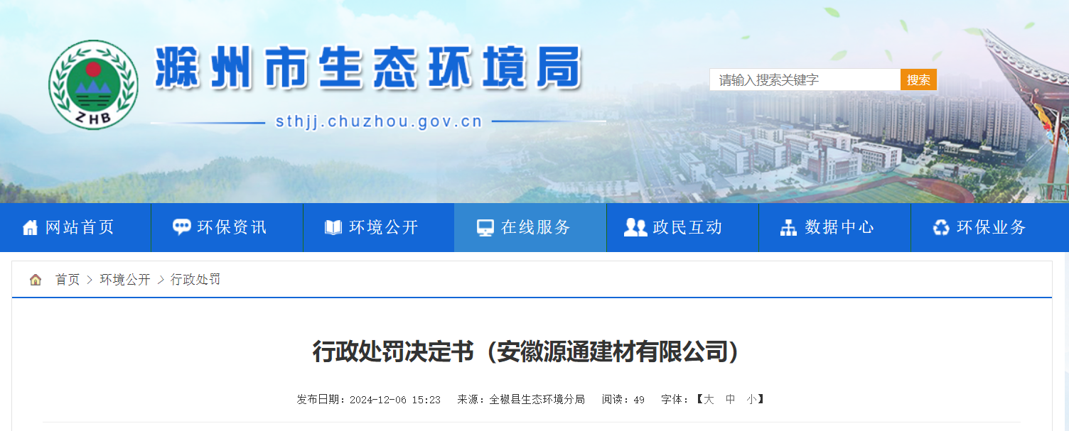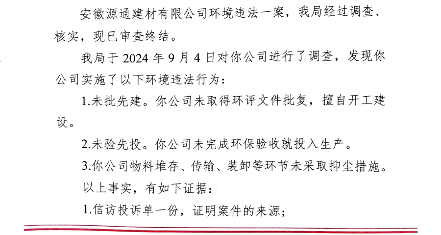 近日,滁州市生态环境局披露行政处罚信息,因未批先建、未验先投,物料堆存、传输、装卸未采取防尘措施,安徽源通建材有限公司被罚款27.2万,行政处罚决定书文号为皖滁环(全)罚〔2024〕31号。