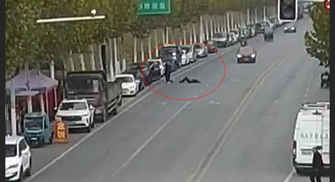 路上来往车辆较多,危险随时可能发生。此时,一名男子跑了过来,蹲在老人旁边查看伤情,并拨打了120。