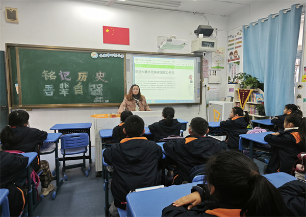 少先队活动课上,各中队召开了“铭记历史 吾辈自强”主题班会。活动中,各班通过课件讲解和视频观看让学生了解南京大屠杀那段屈辱的历史,牢记国家公祭的意义——勿忘国殇,珍惜和平。最后各中队辅导员还呼吁孩子们一起为在南京大屠杀中遇难的30万同胞默哀致敬。