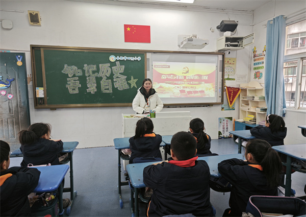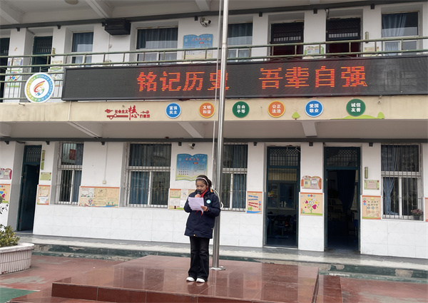升旗仪式上,大队委宣传委员吴雨茉带领全体师生回顾了南京大屠杀的历史,提醒队员们不能忘记民族曾经遭受的苦难,倡议队员们继承和发扬革命先辈的优良传统,勤学上进,为实现中国梦而努力。