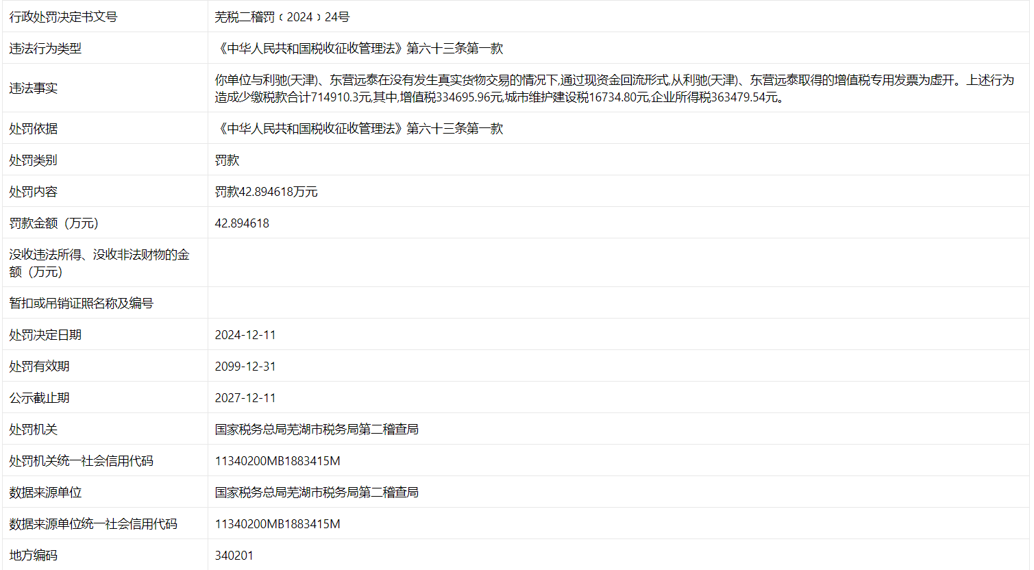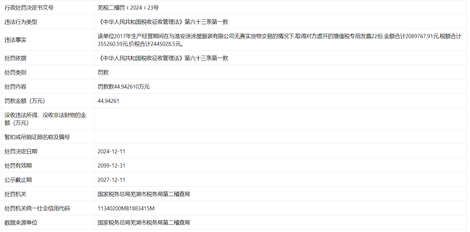 近日,信用芜湖披露行政处罚信息,因涉税务违法,芜湖市华达服装有限公司、无为南洋管业有限公司、繁昌县勇洁服饰有限公司分别被罚款121.841834万元、42.894618万元、44.94261万元。