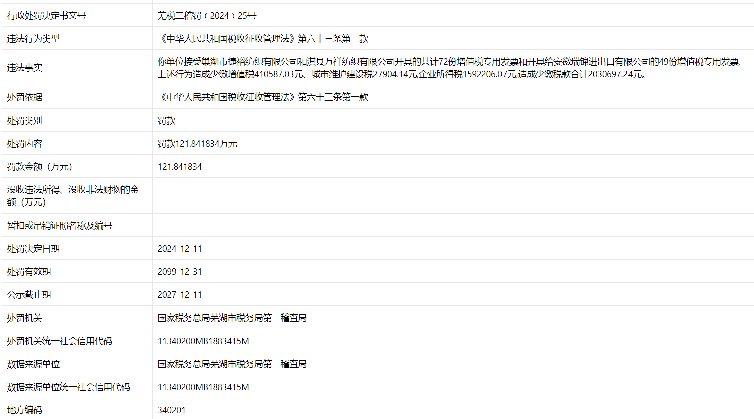 公开处罚信息显示,芜湖市华达服装有限公司接受巢湖市捷裕纺织有限公司和淇县万祥纺织有限公司开具的共计72份增值税专用发票和开具给安徽瑞锦进出口有限公司的49份增值税专用发票,该行为造成少缴增值税410587.03元、城市维护建设税27904.14元,企业所得税1592206.07元,造成少缴税款合计2030697.24元。