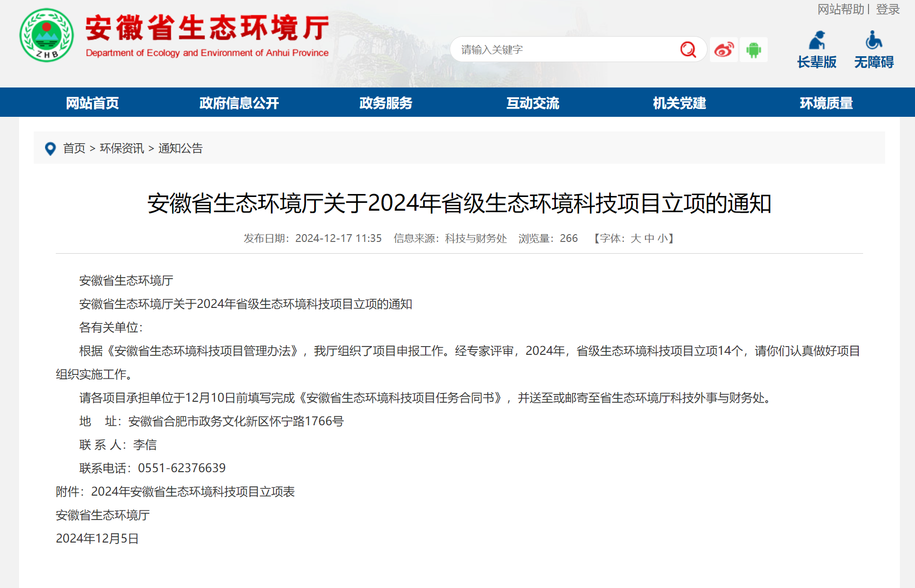 近日,安徽省生态环境厅发布《关于2024年省级生态环境科技项目立项的通知》公告,经专家评审,2024年,省级生态环境科技项目立项14个。详情如下: