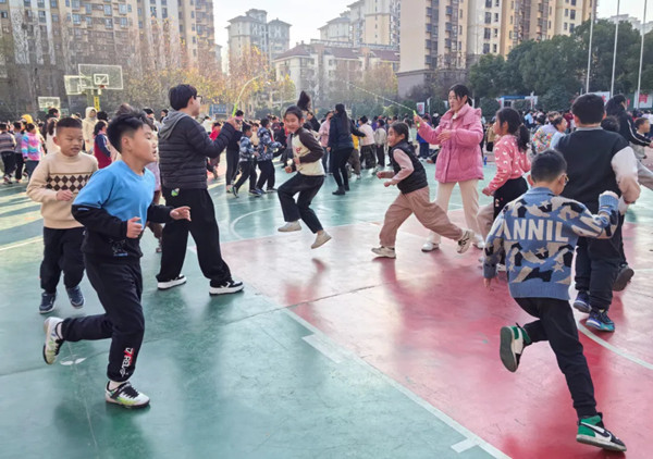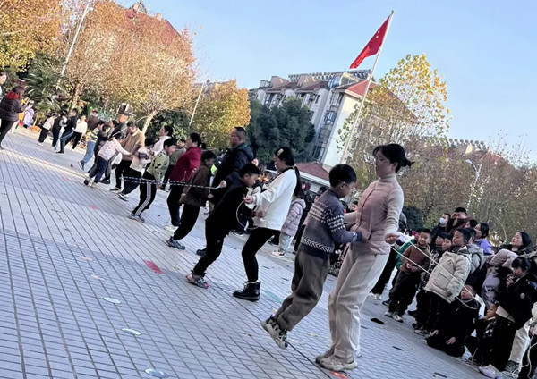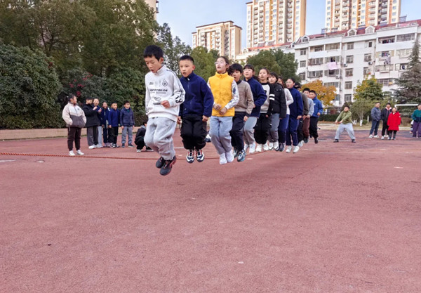 单人跳绳、双人跳绳、亲子跳、集体跳、穿龙跳……形式多样、缤纷多彩的项目在各个赛场上同时开赛。细长的绳子上下翻飞,灵巧的脚步不停跳动,赛场上的同学们聚精会神、奋力拼搏,赛场外,班级啦啦队加油助威、呐喊不断。