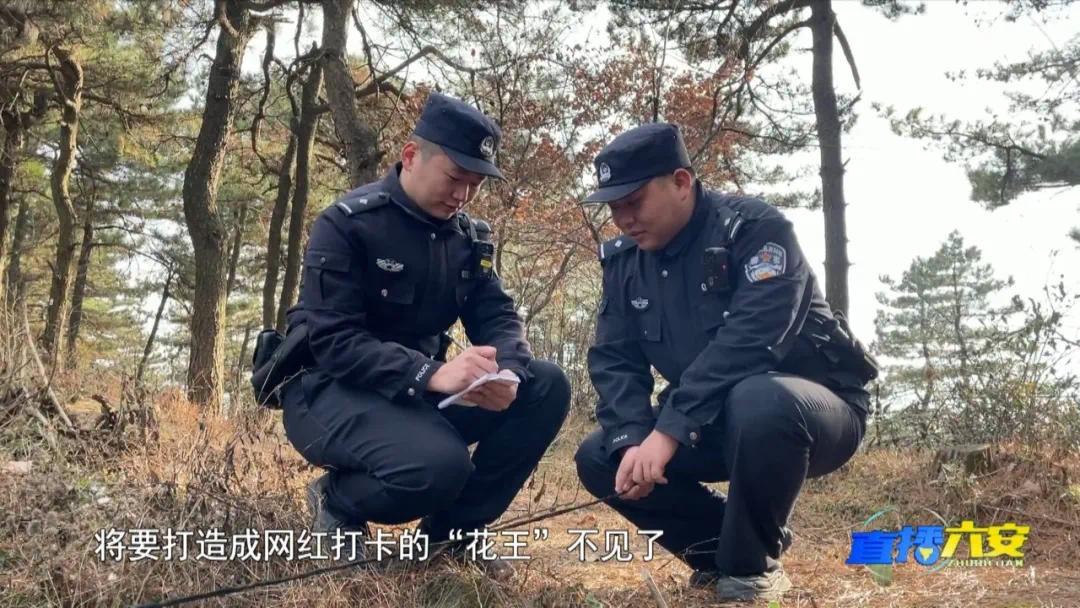 金寨县公安局吴家店派出所民警 冯新宇:现场我们就发现,景区内一棵将要打造成网红打卡的“花王”不见了,后来我们经过排查,其他地方也有多处土坑,被挖的映山红至少有3、4棵,我们判断应该是一起有预谋的盗窃行为。