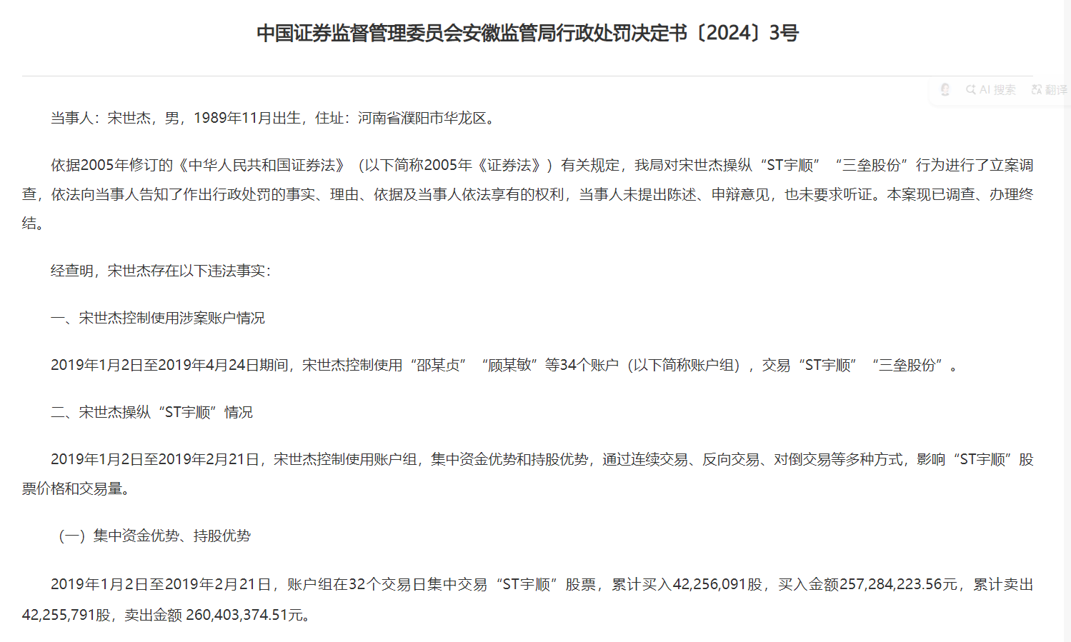 公开处罚信息显示,2019年1月2日至2019年4月24日期间,宋世杰控制使用“邵某贞”“顾某敏”等34个账户(以下简称账户组),交易“ST宇顺”“三垒股份”。期间(2019年1月2日至2019年2月21日)宋世杰控制使用账户组,集中资金优势和持股优势,通过连续交易、反向交易、对倒交易等多种方式,影响“ST宇顺”股票价格和交易量。