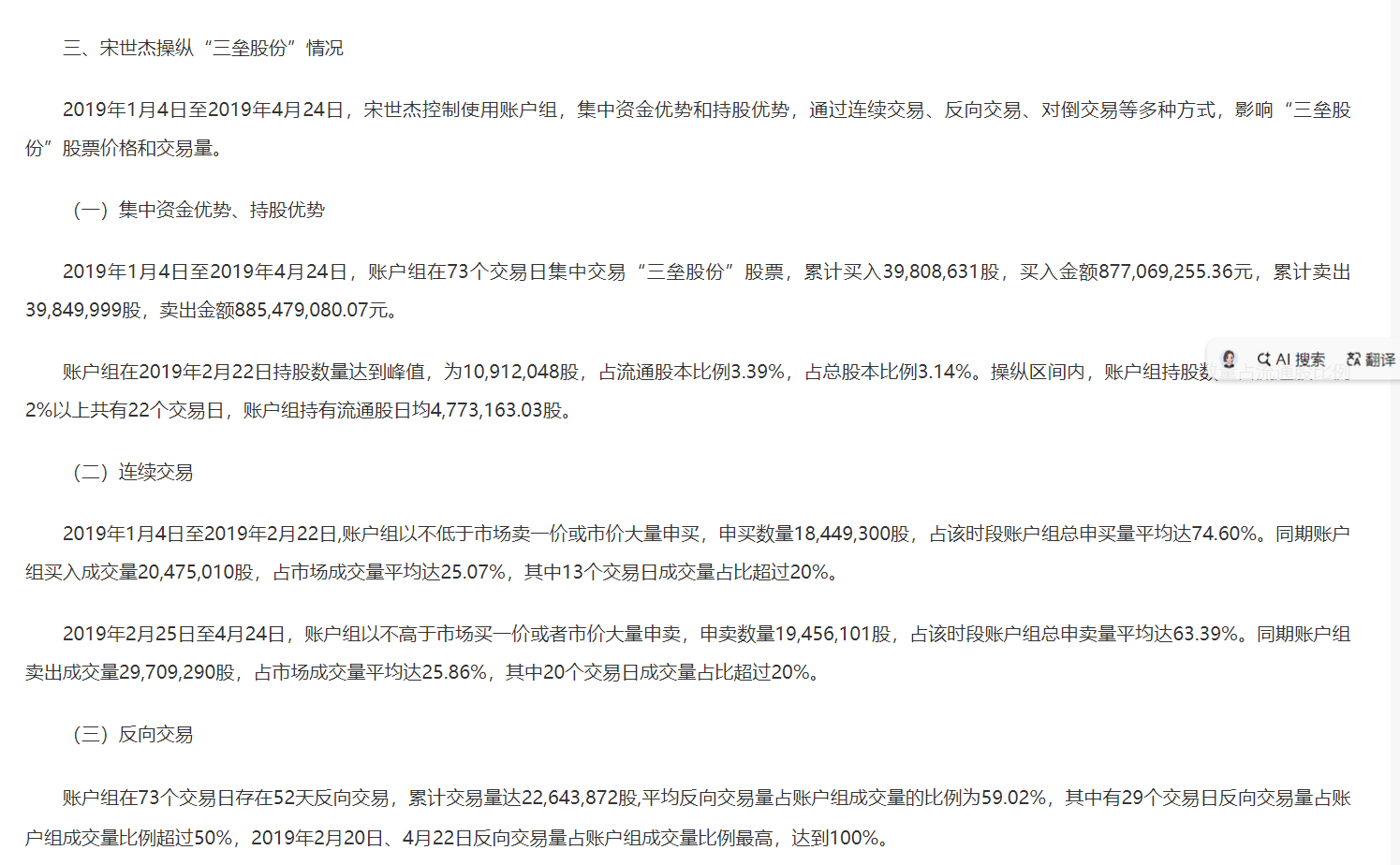 同时,在操纵“三垒股份”情况, 2019年1月4日至2019年4月24日,宋世杰控制使用账户组,集中资金优势和持股优势,通过连续交易、反向交易、对倒交易等多种方式,影响“三垒股份”股票价格和交易量。