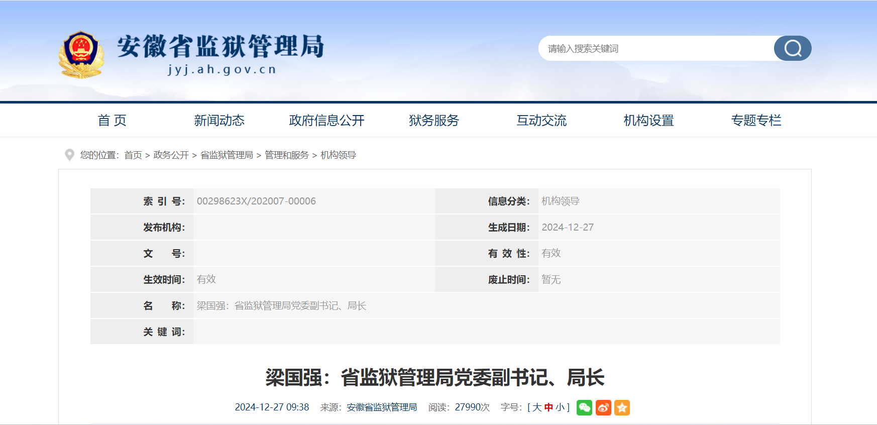 据12月27日安徽省监狱管理局官网网站“机构领导”一栏更新显示,梁国强已任省监狱管理局党委副书记、局长。
