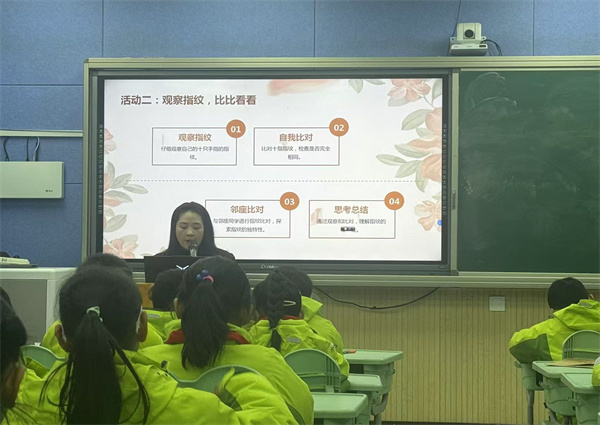 本次讲座邀请了安徽高诚创新教育研究院朱婷婷老师到校主讲。朱婷婷老师首先向学生介绍生命的价值,使同学们深刻的认识到生命的来之不易。在随后的课堂活动“观察指纹,比比看看”中,孩子们在观察指纹的过程中了解到自身的独特性;最后在“自我赞扬,书写优点”的活动过程中分享自己对珍惜生命这一宏观主题的的认识。