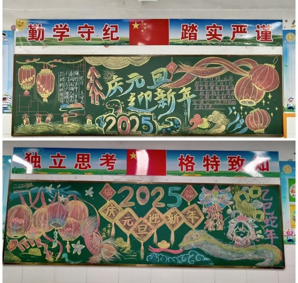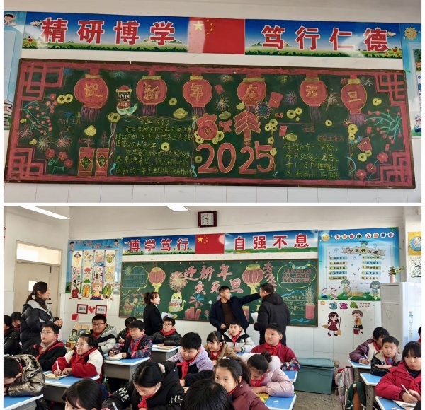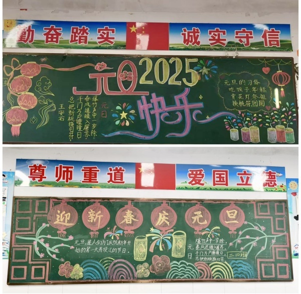 活动中,各班级积极响应,同学们在老师们的指导下,充分发挥想象力与创造力,围绕“元旦”主题精心设计黑板报。大家分工协作,从板块构思、内容选取到色彩搭配、图案绘制,都一丝不苟。