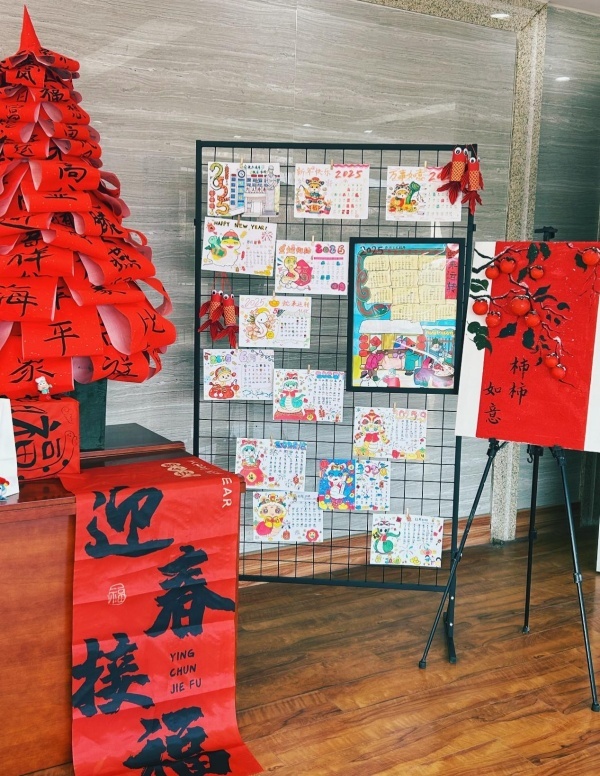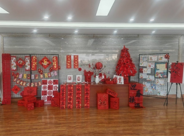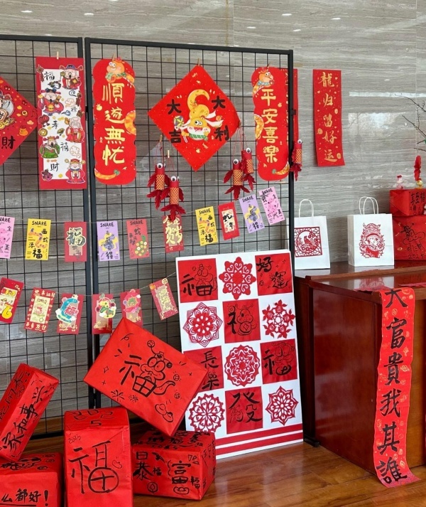 展览现场,一系列精美的手工作品吸引了众多师生的目光。从传统的春联、剪纸到蛇年日历、新年红包,每一件作品都凝聚了学生们的心血和创意。特别是蛇年红包制作,不仅体现了中国春节的习俗,更融入了学生们的巧思和对新年的美好祝愿。