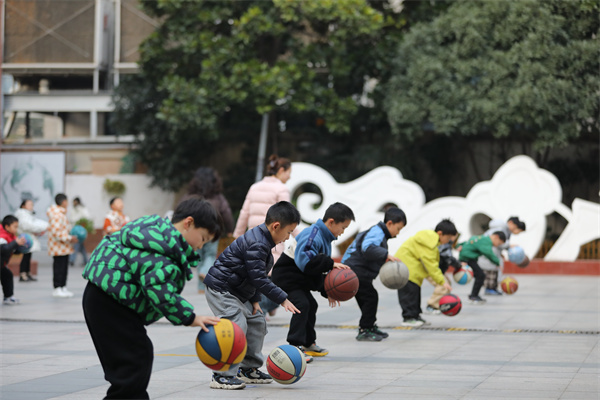 拍球比赛时,同学们都聚精会神,打开双脚,压低身体,小手灵活地控制着弹跳的篮球。一下、两下、三下……一个个篮球在上下跳动,一双双紧张又认真的眼睛紧紧盯着自己的篮球,认真而专注。
