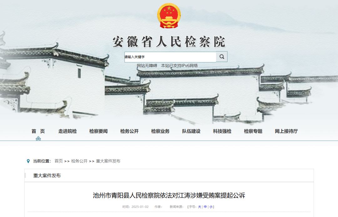 据安徽省人民检察院网站1月2日消息显示,池州市住房和城乡建设局原党组成员、副局长江涛(副处级)涉嫌受贿罪一案,由池州市监察委员会调查终结,经池州市人民检察院指定管辖,由青阳县人民检察院依法向青阳县人民法院提起公诉。案件正在进一步办理中。