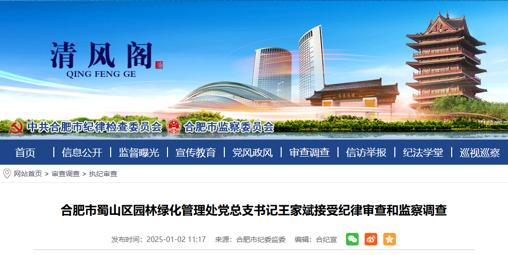 据合肥市纪检监察网站1月2日消息显示,合肥市蜀山区园林绿化管理处党总支书记王家斌涉嫌严重违纪违法,主动投案,目前正接受蜀山区纪委监委纪律审查和监察调查。