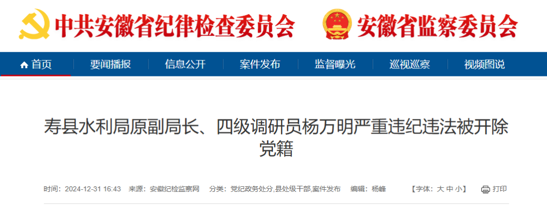 据安徽纪检监察网12月31日消息显示,经中共寿县县委批准,寿县纪委监委对寿县水利局原副局长、四级调研员杨万明严重违纪违法问题进行了立案审查调查。