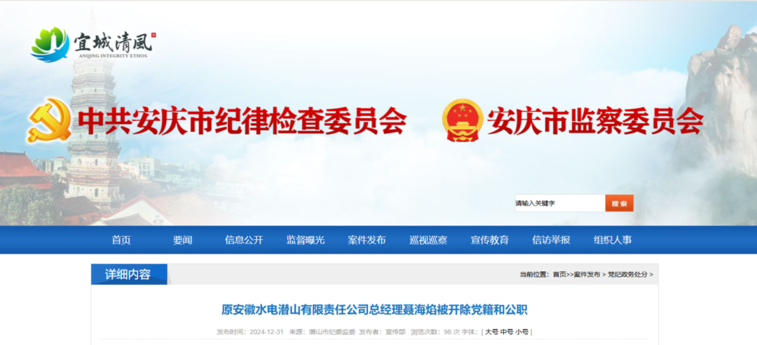据潜山市纪委监委网站12月31日消息显示,潜山市纪委监委对原安徽水电潜山有限责任公司总经理聂海焰严重违纪违法问题进行了立案审查调查。