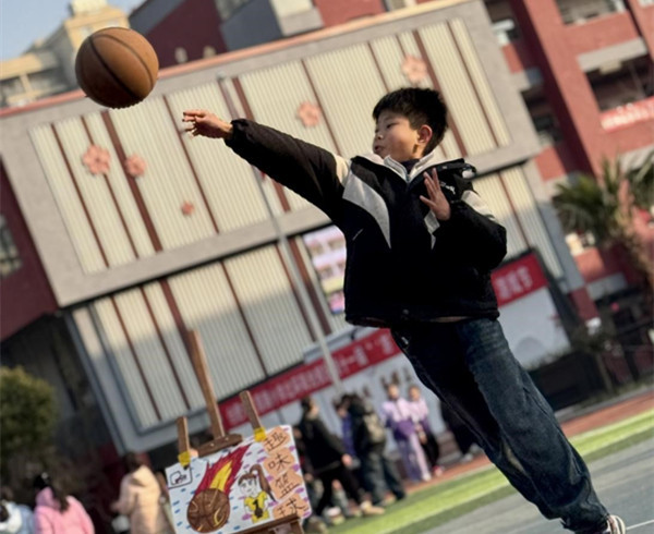 高年级学生在操场上进行了“篮球探索迷宫,趣味投篮……”活动,学生手抱篮球走出迷宫后,终于来到投篮区域。只见他们右手将篮球高高举起,腾空一跃,瞄准篮筐,敏捷的动作、矫健的身姿,令人叫好。其他的体育竞技游戏,都留下了学生们生龙活虎的身影。