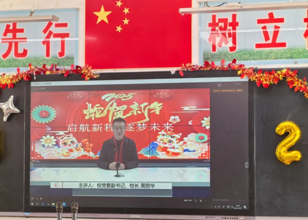 下午两时整,该校党委副书记、校长周丽华通过校园广播向全体师生送上了新年祝福,他简要回顾了过去一年学校为梦想跋山涉水、追风赶月的发展足迹。他指出发展路上,没有等出来的成绩,只有干出来的辉煌,2025年,全体师生将把赤诚丹心与无限热爱铭记于心,在时光的交错中共创“为党育人、为国育才”新辉煌。