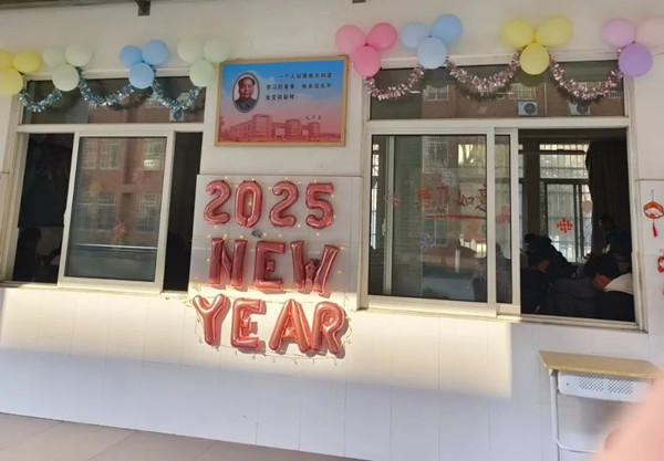 精心描画的艺术字是对新年的祝福;气球和彩带在同学们的手中变幻出温馨的天地;课桌围成了梦幻的舞台;鲜花、零食、水果和饮料都装点着今天满溢的快乐。同学们精心布置,把自己的“家”装扮一新。