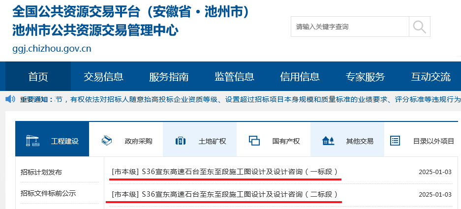 近日,池州市公共资源交易管理中心发布S36宣东高速石台至东至段施工图设计及设计咨询(一标段、二标段)招标公告。