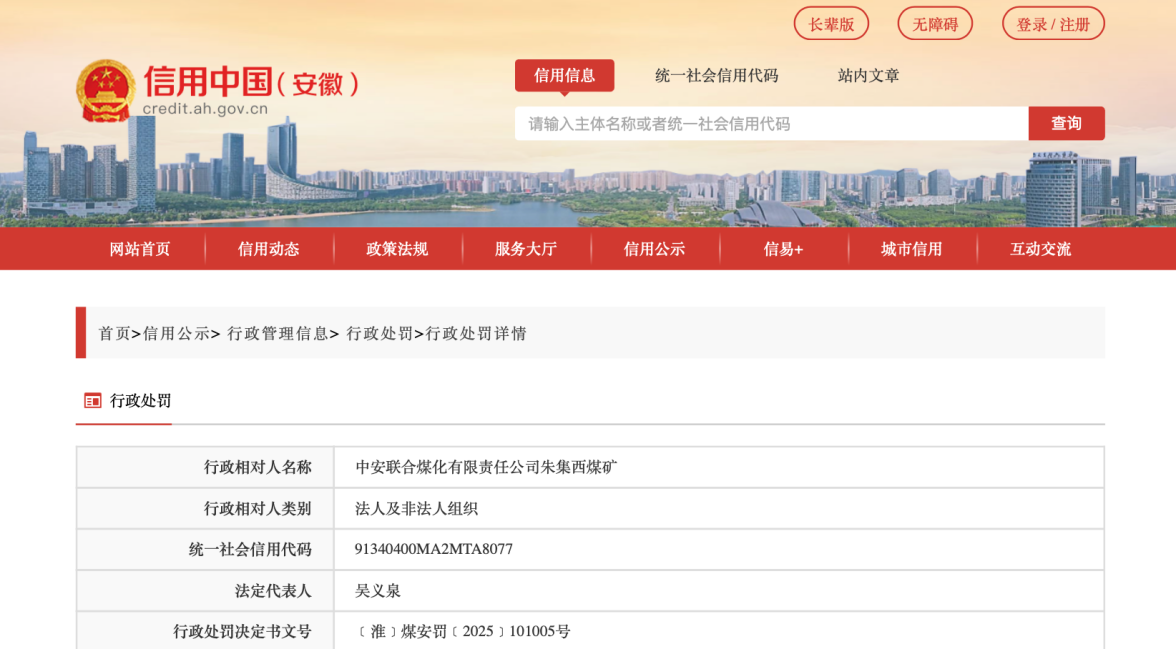 近日,信用安徽披露行政处罚信息,因涉及安全设备使用维护等多项违法违规行为,中安联合煤化有限责任公司朱集西煤矿被处罚款21.5万元,行政处罚决定书文号为﹝淮﹞煤安罚﹝2025﹞101005号。