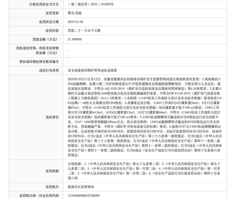 公开处罚信息显示,2024年10月11日至12日,安徽省能源局会同淮南市煤矿安全监督管理局进行现场检查时发现: