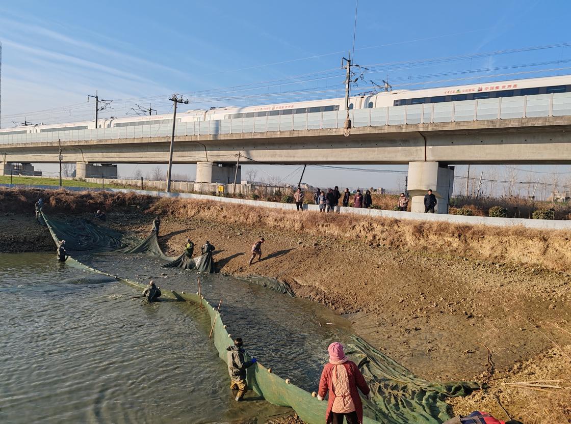 在大店村水产基地的河道上,工作人员身着专业的防水服,手持渔网,忙碌而有序地捕捞着鲜鱼。随着一网网鱼儿跃出水面,大家脸上都洋溢着满足和喜悦的笑容。