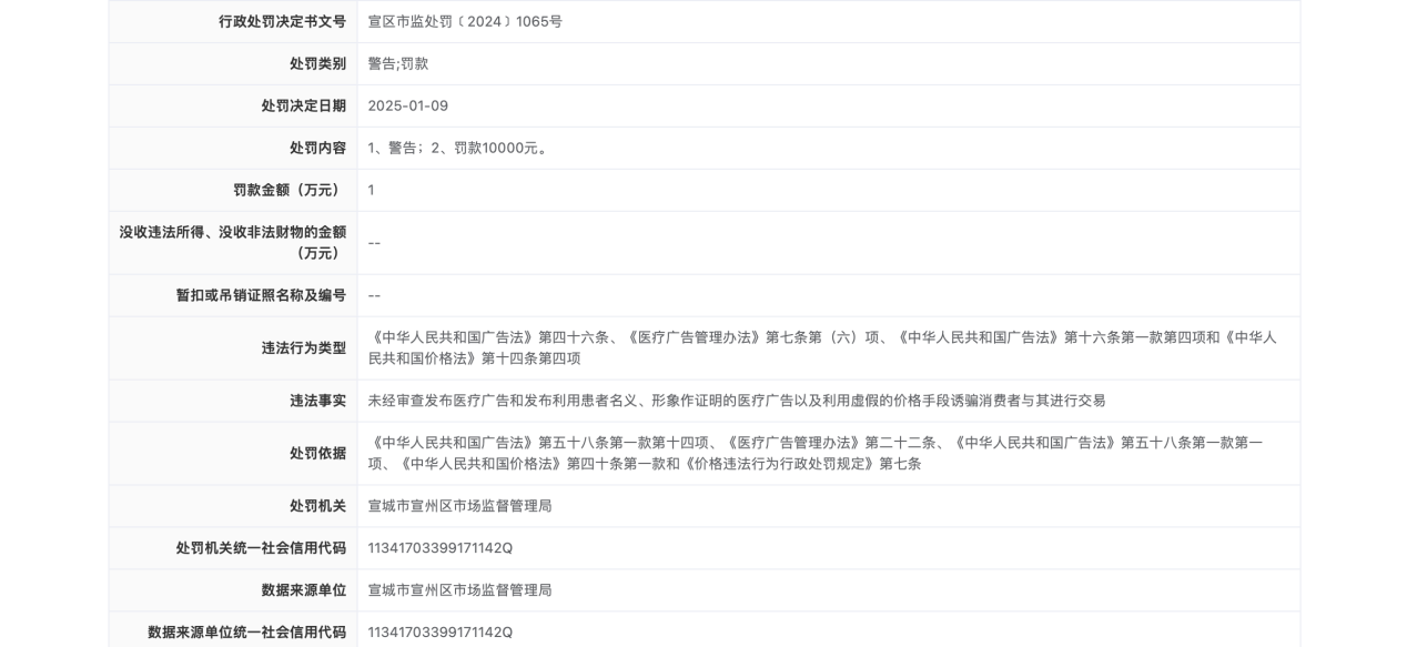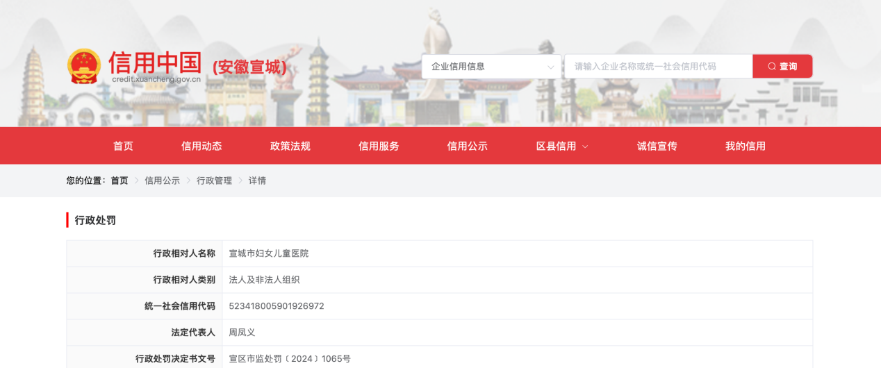 近日,信用宣城披露行政处罚信息,因未经审查发布医疗广告和发布利用患者名义、形象作证明的医疗广告以及利用虚假的价格手段诱骗消费者与其进行交易,宣城市妇女儿童医院被罚款1万元并被处以警告,行政处罚决定书文号为宣区市监处罚﹝2024﹞1065号。