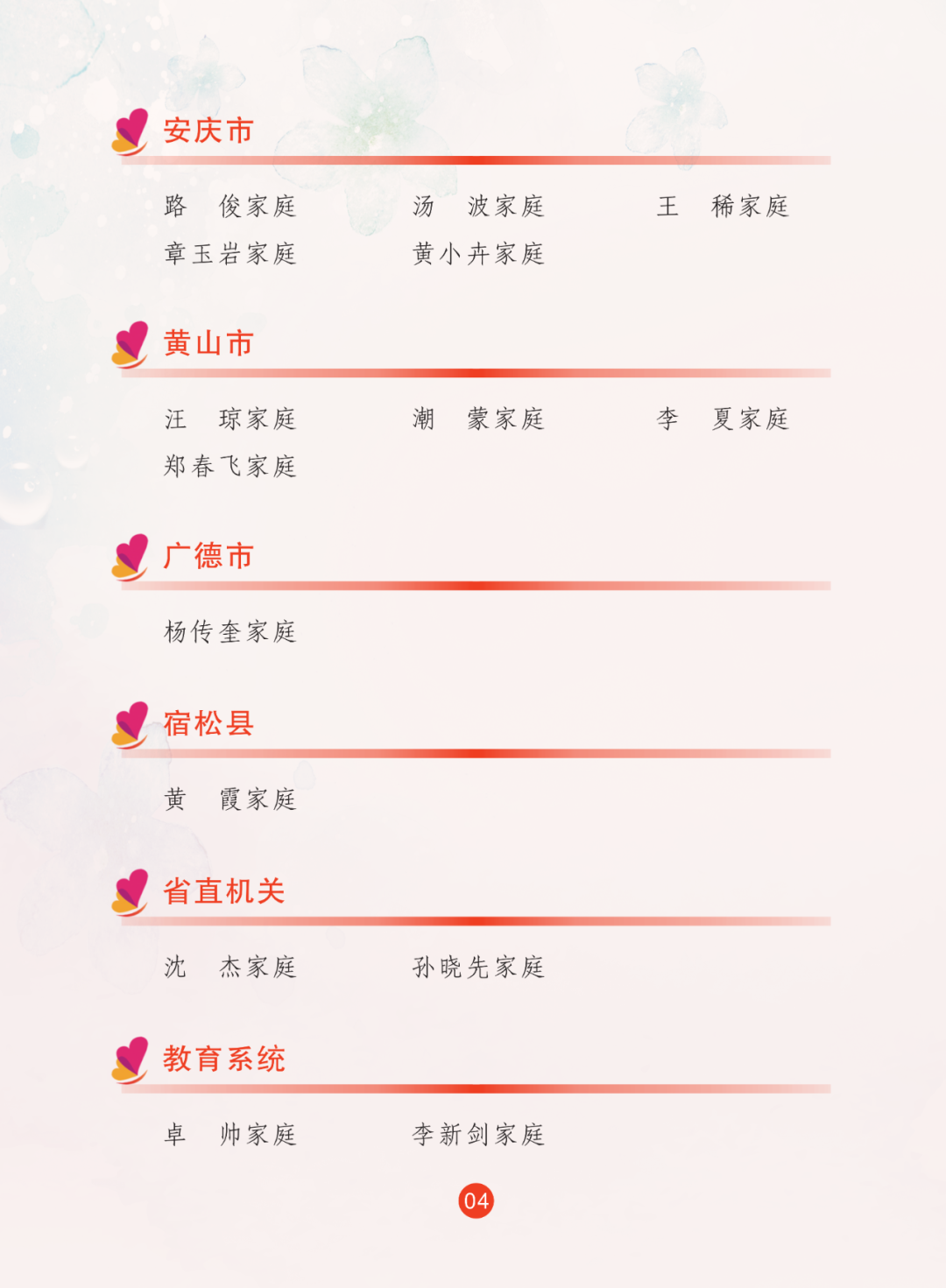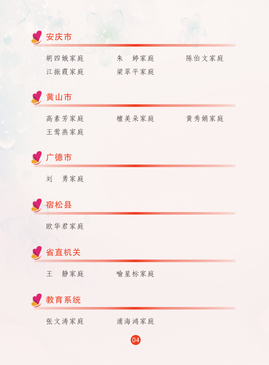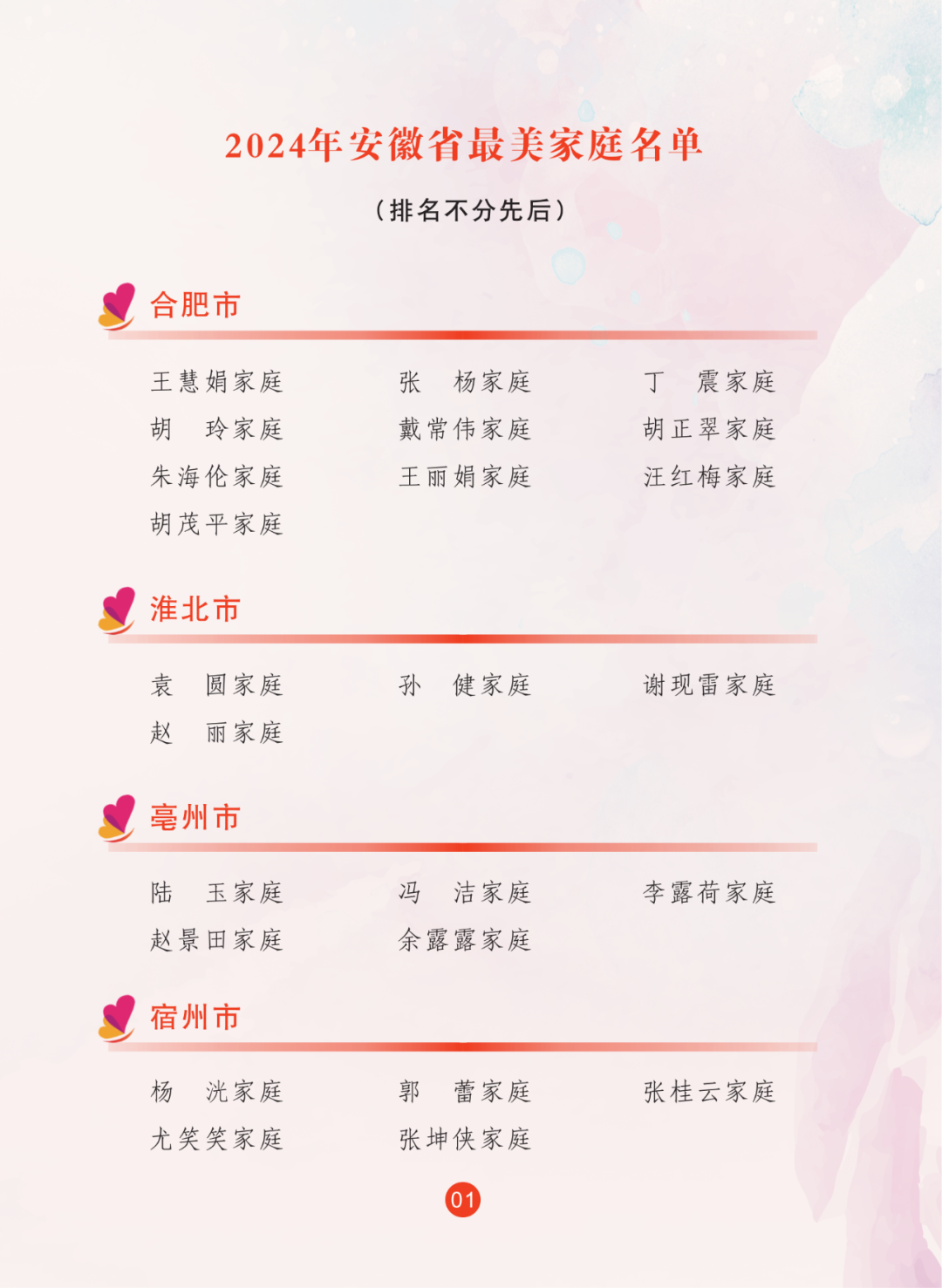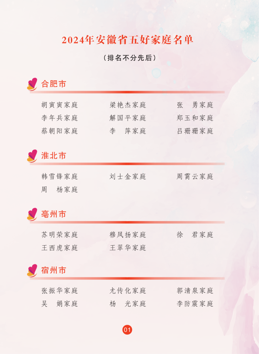 2024年,省妇联全面贯彻落实习近平总书记关于注重家庭家教家风建设重要论述,继续联合省委宣传部宣传选树最美家庭,共推选出100户安徽省最美家庭。省妇联推选97户安徽省五好家庭。名单如下: