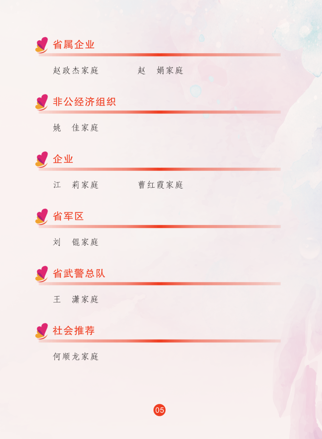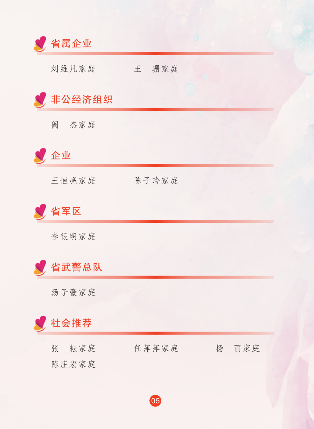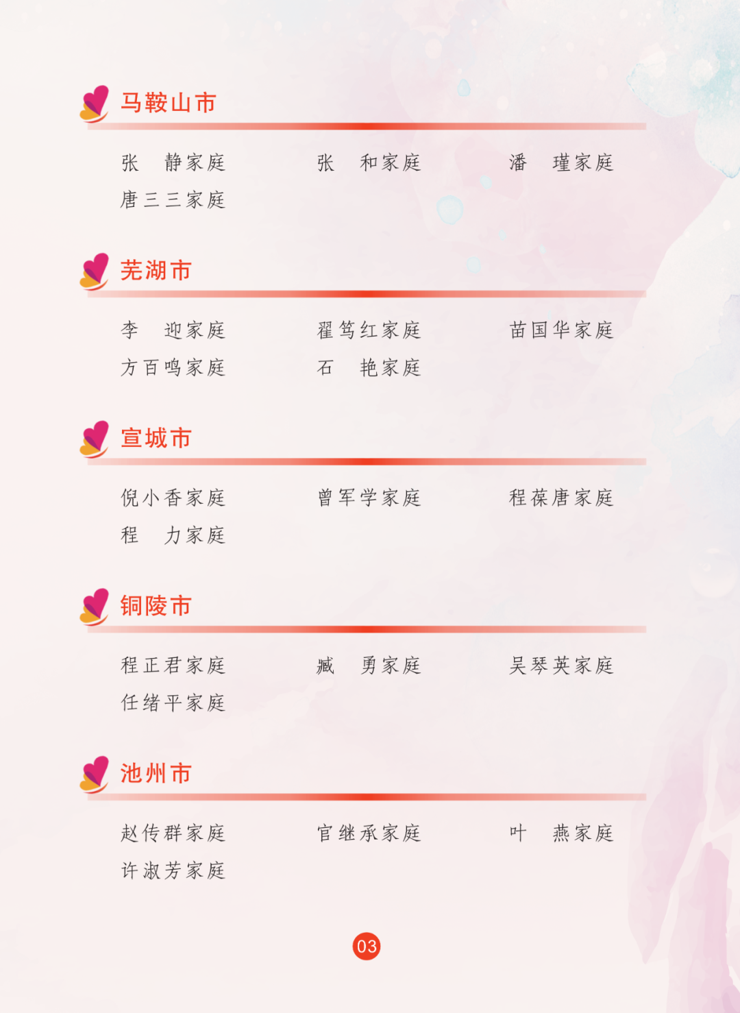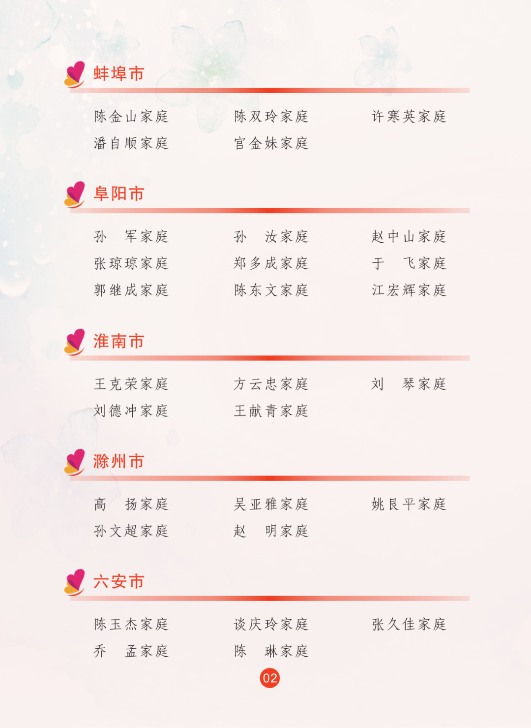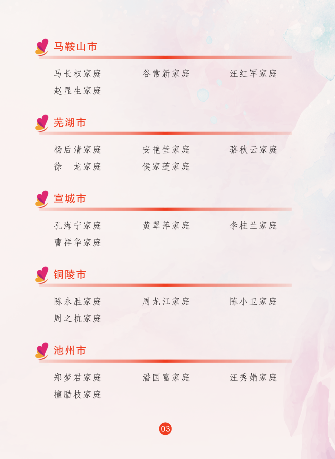 2024年,省妇联全面贯彻落实习近平总书记关于注重家庭家教家风建设重要论述,继续联合省委宣传部宣传选树最美家庭,共推选出100户安徽省最美家庭。省妇联推选97户安徽省五好家庭。名单如下: