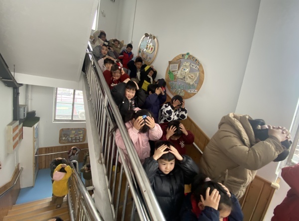 随着第二声警报声响起,幼儿在老师的带领下弯腰、护头,迅速且有序沿着指定疏散路线撤离,老师们按照各自职责,保护幼儿,检查是否有掉队的孩子,确保每位幼儿的安全。