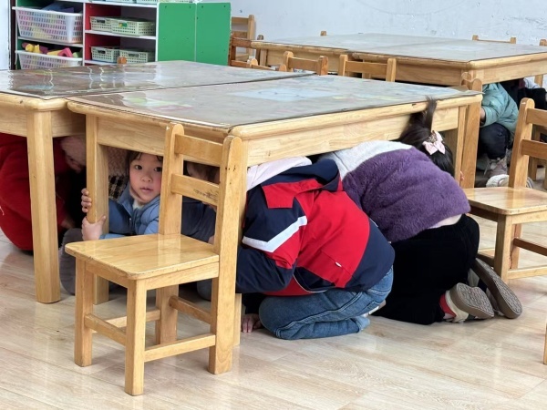 第一次警报声响起,防震应急疏散演练正式开始!全园师幼立即停止活动,以最快速度躲避到安全区域,迅速抱头、躲在桌下,尽量蜷曲身体,降低身体重心,尽可能保护头部和眼睛,并远离窗户。