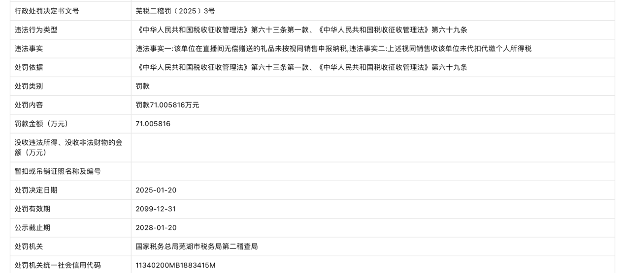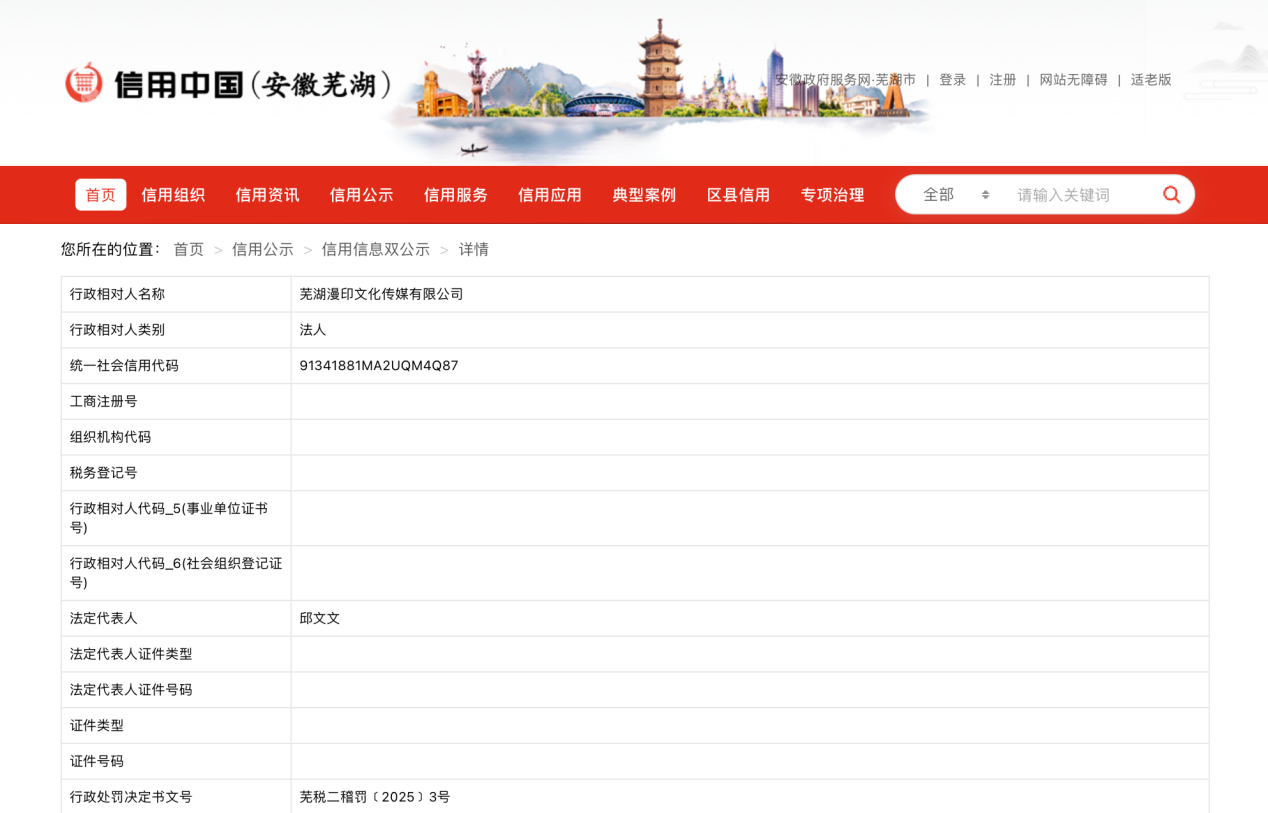 近日,信用芜湖披露行政处罚信息,芜湖漫印文化传媒有限公司涉税务违法被罚款71.005816万元。行政处罚决定书文号为芜税二稽罚﹝2025﹞3号。