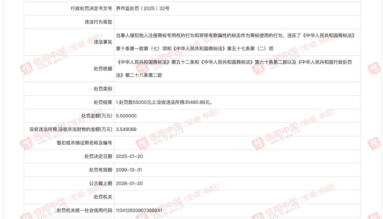 近日,信用阜阳披露行政处罚信息,因侵犯他人注册商标专用权、将带有欺骗性的标志作为商标使用,安徽省麒禾堂药业有限公司被罚没合计90490.88元。行政处罚决定书文号为界市监处罚﹝2025﹞32号。