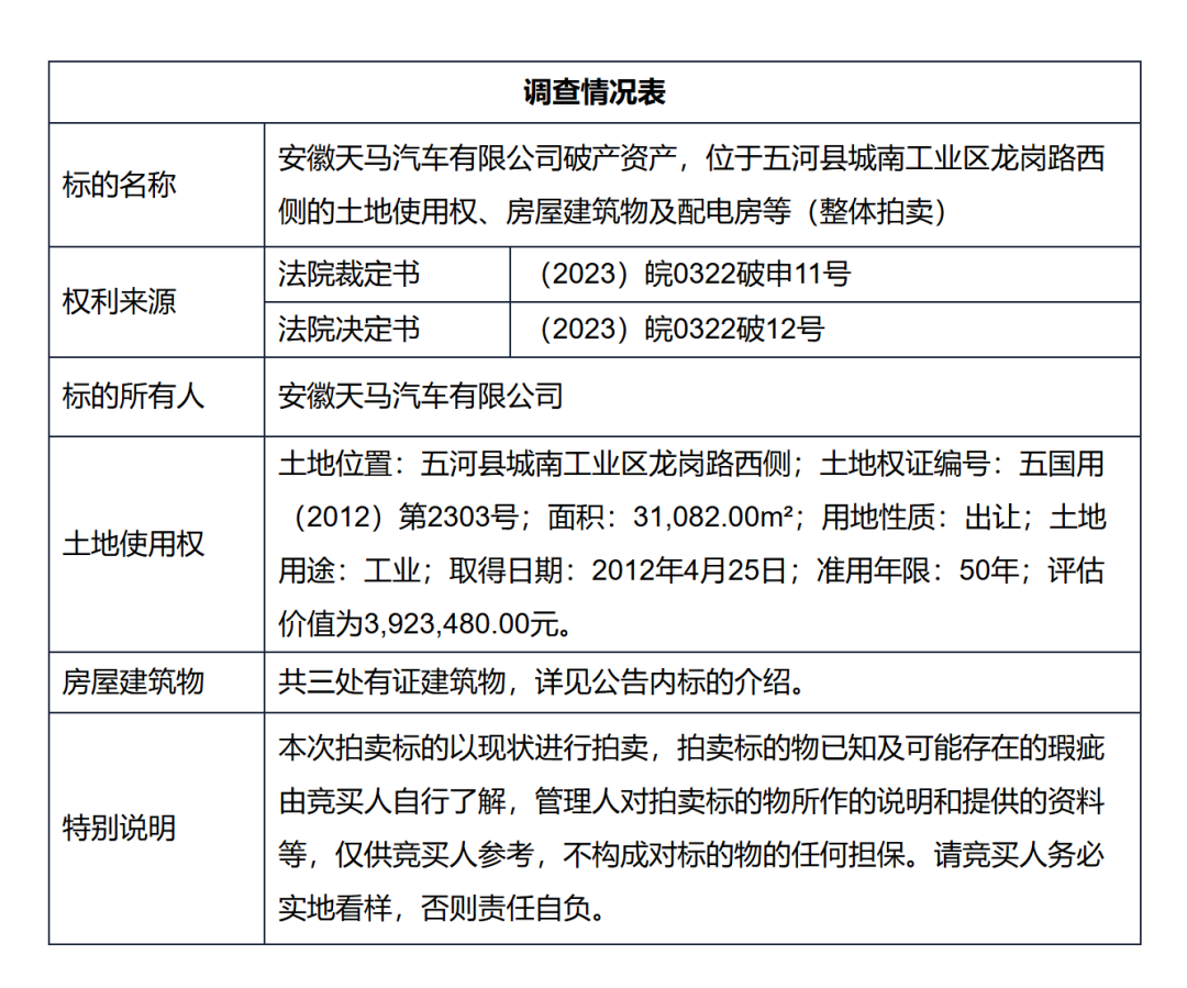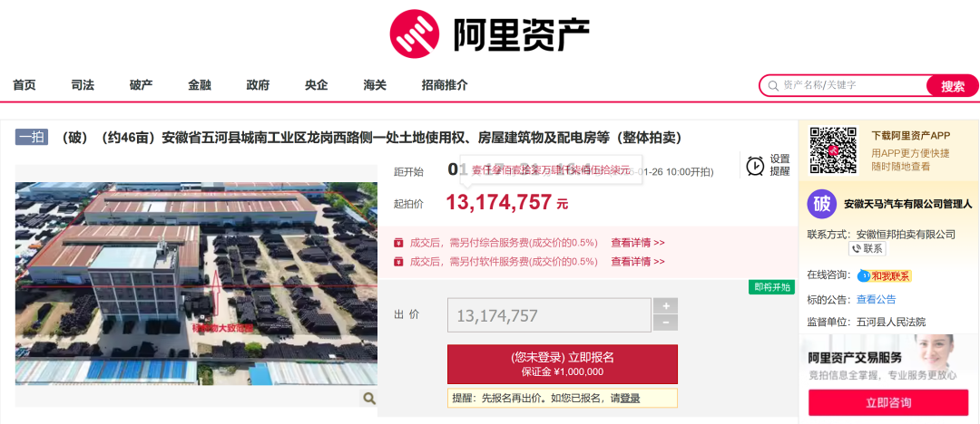 1月26日至27日,安徽天马汽车有限公司管理人将在淘宝网阿里拍卖破产平台上公开拍卖该公司资产。
