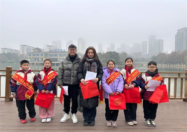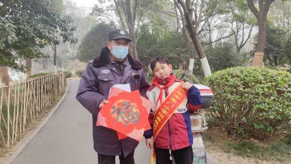上午10点,少先队员们整理好衣着,带上精心书写好的“福”和提前打印好的“安全温馨提示书”出发前往菱湖公园进行宣传。