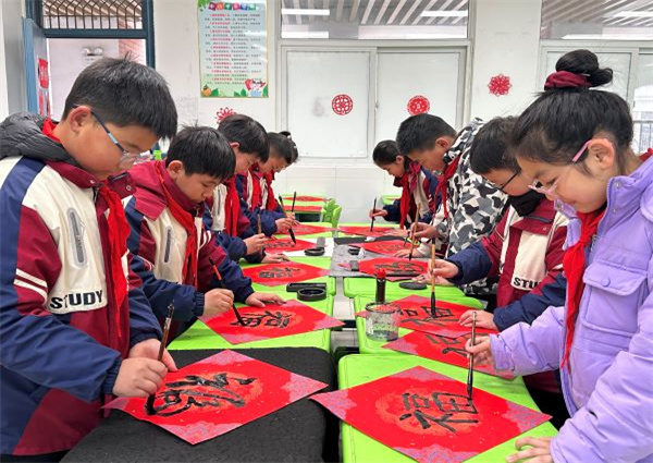 1月23日上午,队员们早早就来到学校门口集合,在辅导员和家长的带领下,进入班级激动的拿出提前准备好的笔墨纸砚,开始挥毫泼墨,一张张满含祝福的“福”字在队员们的笔下诞生。
