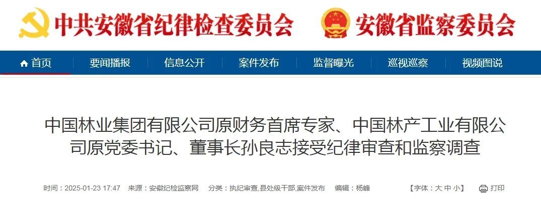 中国林业集团有限公司原财务首席专家、中国林产工业有限公司原党委书记、董事长孙良志涉嫌严重违纪违法,目前正接受中国林业集团有限公司纪委纪律审查和安徽省宣城市监察委员会监察调查。