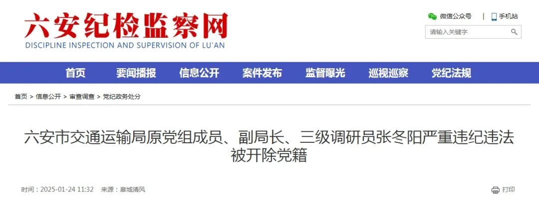 日前,经中共六安市委批准,六安市纪委监委对六安市交通运输局原党组成员、副局长、三级调研员张冬阳严重违纪违法问题进行了立案审查调查。