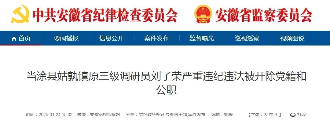 日前,经中共马鞍山市委批准,马鞍山市纪委监委对当涂县姑孰镇原三级调研员刘子荣严重违纪违法问题进行了立案审查调查。