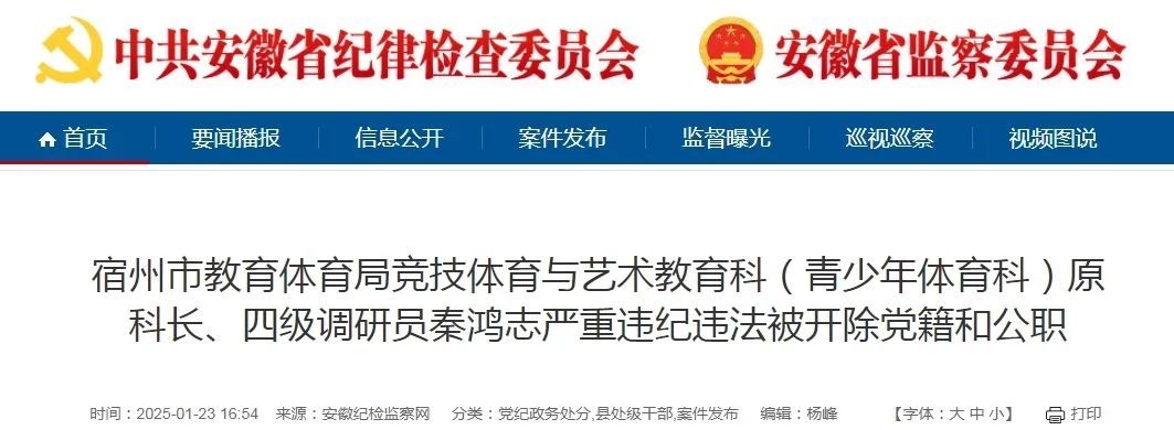 日前,经宿州市纪委监委指定管辖,宿州市埇桥区纪委监委对宿州市教育体育局竞技体育与艺术教育科(青少年体育科)原科长、四级调研员秦鸿志严重违纪违法问题进行了立案审查调查。