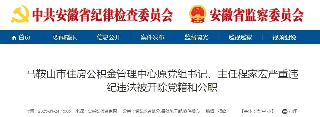 日前,经中共马鞍山市委批准,马鞍山市纪委监委对马鞍山市住房公积金管理中心原党组书记、主任程家宏严重违纪违法问题进行了立案审查调查。
