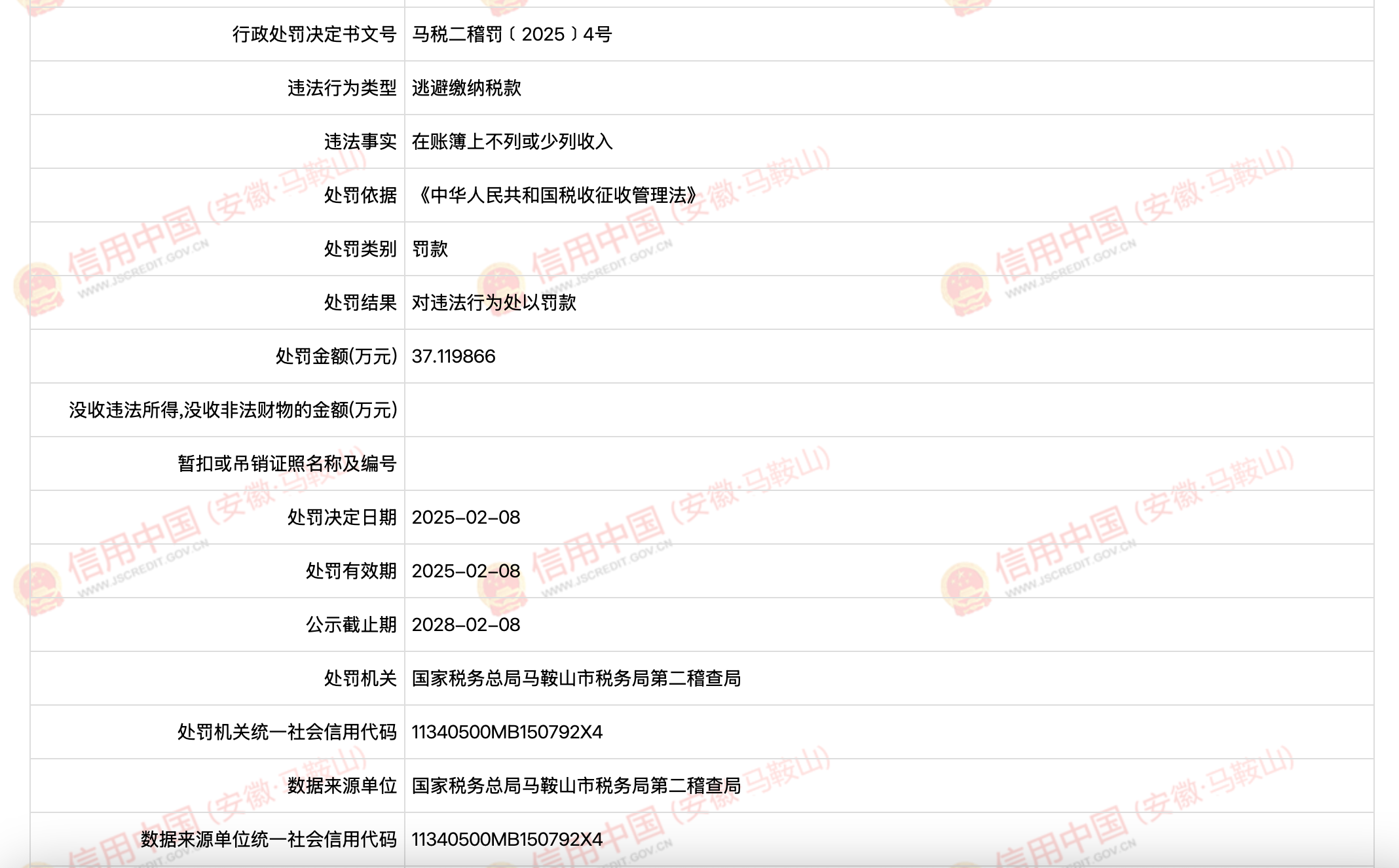 公开处罚信息显示,该公司在账簿上不列或少列收入。依据《中华人民共和国税收征收管理法》,国家税务总局马鞍山市税务局第二稽查局决定对该公司处罚款37.119866万元。