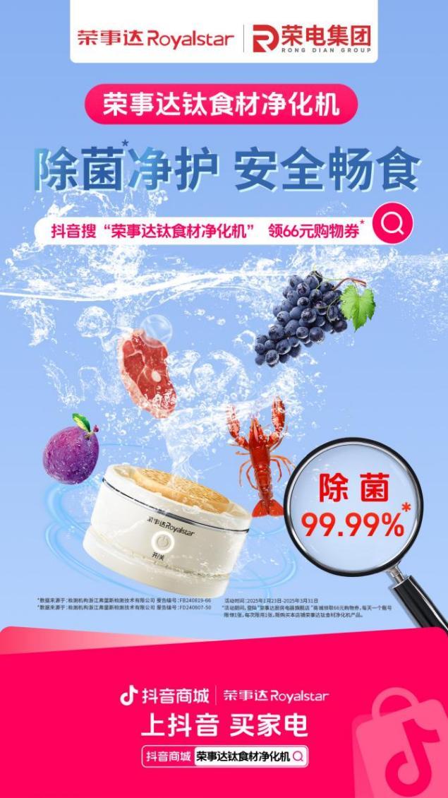 值此春季病菌多发之际,荣电集团旗下荣事达品牌携手抖音商城,推出荣事达钛系列产品限时惊喜特惠。进抖音搜索“荣事达钛食材净化机”,登陆“荣事达厨房电器旗舰店 ”领取66元专属购物券;守护我们的餐桌安全,让健康尽在掌握!