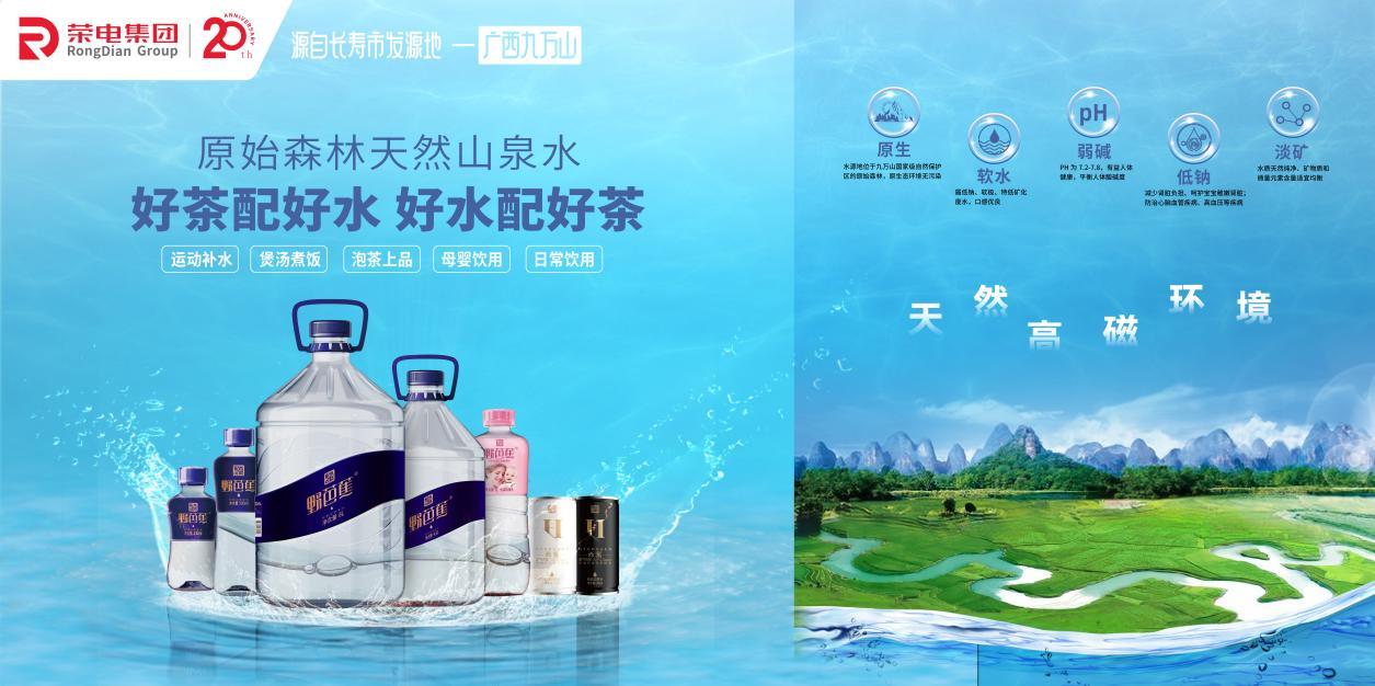 荣电集团推出的水生态系列产品,水源分别源自广西河池市九万山原始森林中的三个天然自涌泉,集“原生、软水、弱碱、低钠、淡矿”五大特点于一体,是国内全行业唯一获得欧盟CE及美国FDA国际双认证的产品。