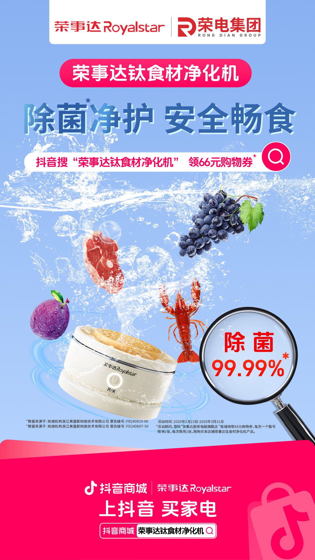 值此春季病菌多发之际,荣电集团旗下荣事达品牌携手抖音商城,推出荣事达钛系列产品限时惊喜特惠。进抖音搜索“荣事达钛食材净化机”,登陆“荣事达厨房电器旗舰店 ”领取66元专属购物券;守护我们的餐桌安全,让健康尽在掌握!