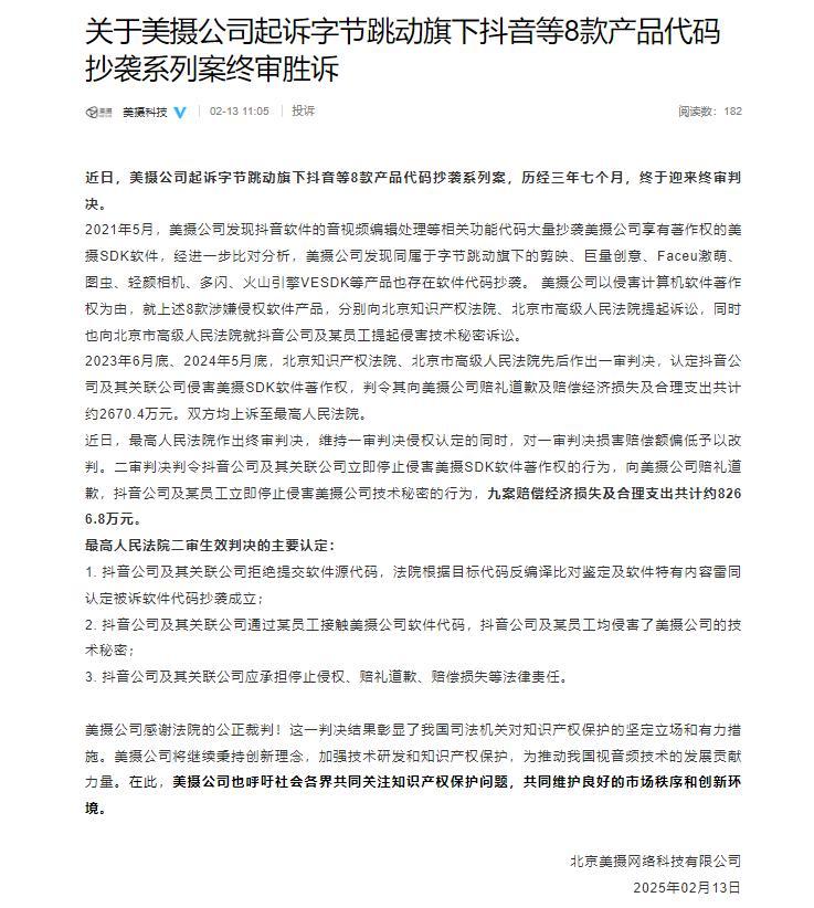 2月13日,美摄科技官微发布声明称,美摄公司起诉字节跳动旗下抖音等8款产品代码抄袭系列案,历经三年七个月,近日迎来终审判决。