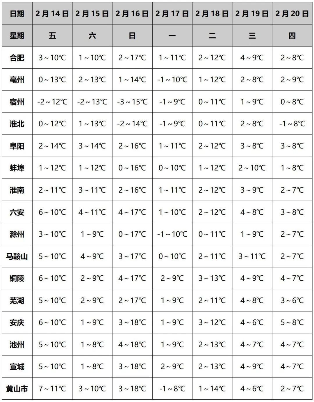 14日(周五):淮北地区多云转阴天;淮河以南阴天,江淮之间南部和江南有小雨,局部地区中雨。