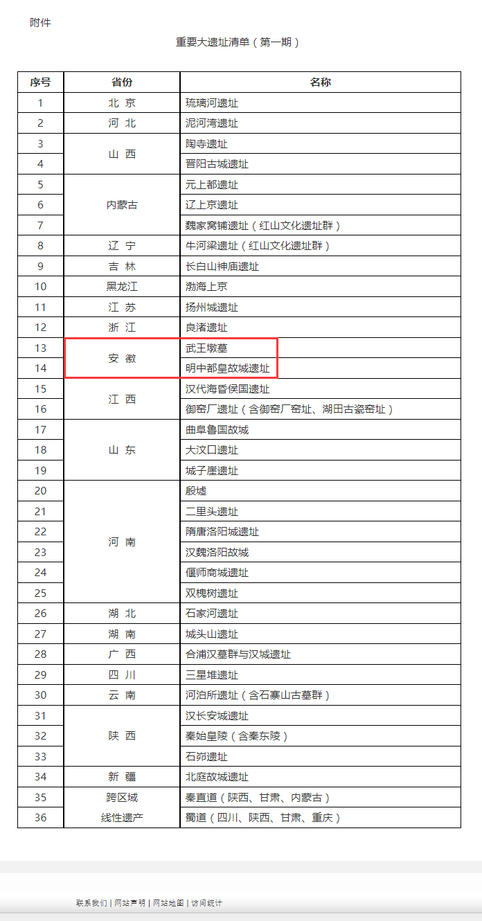 近日,国家文物局网站发布《国家文物局办公室 自然资源部办公厅 农业农村部办公厅关于加强大遗址保护规划和用地保障的通知》,公布了重要大遗址清单(第一期),其中,安徽武王墩墓、明中都皇故城遗址上榜。详情如下: