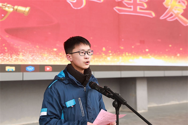 学生代表符伟褀上台发言。他分享了自己在庐江二中学习和生活中的成长与收获,并号召全体同学在新学期里树立远大目标,脚踏实地,勇敢追梦。他表示,作为新时代的青年,肩负着祖国的未来和民族的希望,大家要以实际行动践行青春誓言,努力成为社会的栋梁之材。